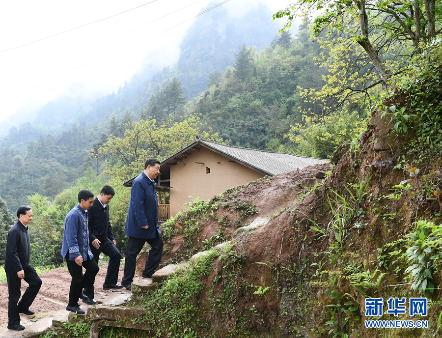 2019年4月15日至17日,習(xí)近平在重慶主持召開解決“兩不愁三保障”突出問題座談會。這是4月15日下午,在石柱土家族自治縣中益鄉(xiāng)華溪村,習(xí)近平踏著濕滑的上坡石階,前往貧困戶譚登周家看望。 新華社記者 謝環(huán)馳 攝