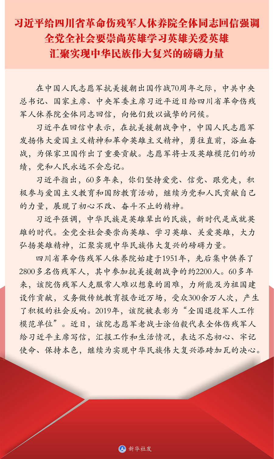 新華社北京10月21日電 在中國(guó)人民志愿軍抗美援朝出國(guó)作戰(zhàn)70周年之際,中共中央總書記、國(guó)家主席、中央軍委主席習(xí)近平近日給四川省革命傷殘軍人休養(yǎng)院全體同志回信,向他們致以誠(chéng)摯的問候。