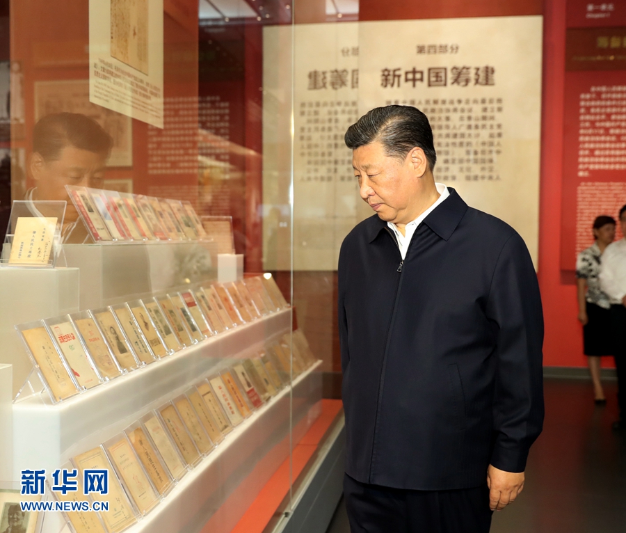 9月12日,中共中央總書記、國家主席、中央軍委主席習(xí)近平視察中共中央北京香山革命紀念地。這是習(xí)近平在香山革命紀念館參觀《為新中國奠基》主題展覽。 新華社記者 黃敬文 攝