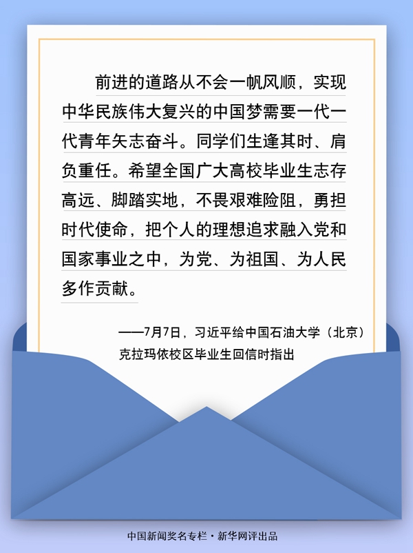 近日,中國石油大學(xué)(北京)克拉瑪依校區(qū)的118名畢業(yè)生給習(xí)近平總書記寫信,匯報了大學(xué)四年學(xué)習(xí)和思想上的收獲,表達(dá)了扎根西部、建設(shè)邊疆的堅強決心。總書記回信肯定他們到邊疆基層工作的選擇,并對廣大高校畢業(yè)生提出殷切期望。