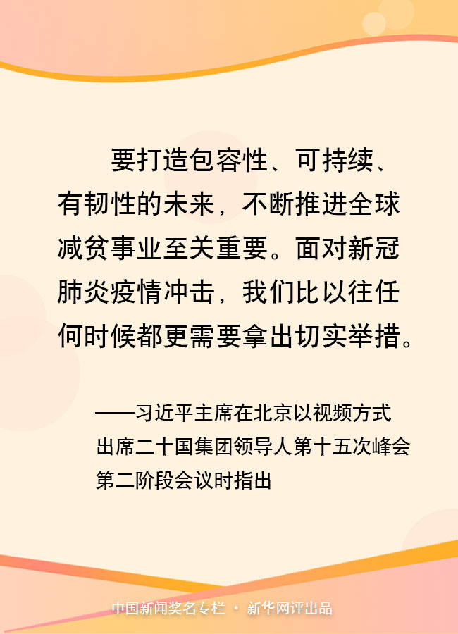 11月22日晚,習近平主席在北京以視頻方式出席二十國集團領導人第十五次峰會第二階段會議,重點闡述關于可持續(xù)發(fā)展問題的看法。他指出,要打造包容性、可持續(xù)、有韌性的未來,不斷推進全球減貧事業(yè)至關重要。面對新冠肺炎疫情沖擊,我們比以往任何時候都更需要拿出切實舉措。