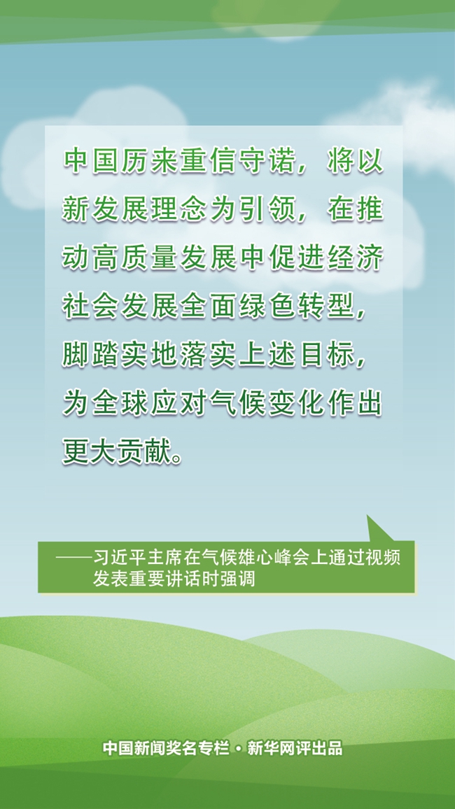 12月12日,國(guó)家主席習(xí)近平在氣候雄心峰會(huì)上通過(guò)視頻發(fā)表重要講話,闡釋?xiě)?yīng)對(duì)氣候變化的中國(guó)主張,宣布中國(guó)國(guó)家自主貢獻(xiàn)最新舉措,為全球氣候治理提振雄心并提供新思路,彰顯中國(guó)與世界各國(guó)攜手助力《巴黎協(xié)定》行穩(wěn)致遠(yuǎn)的決心,展現(xiàn)了中國(guó)重信守諾、為全球應(yīng)對(duì)氣候變化作出更大貢獻(xiàn)的大國(guó)擔(dān)當(dāng)。