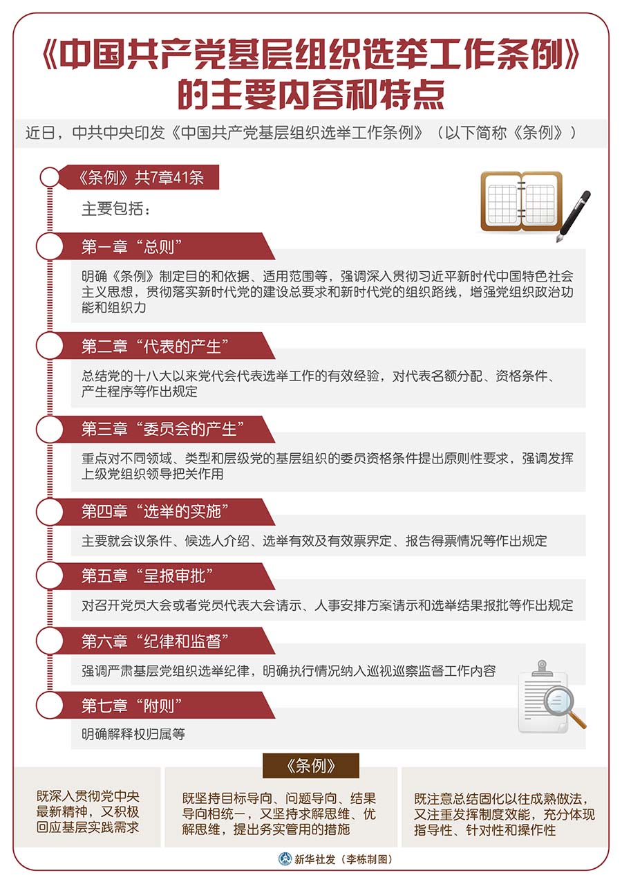 答:《條例》共7章41條,主要包括:第一章“總則”,明確《條例》制定目的和依據(jù)、適用范圍等,強(qiáng)調(diào)深入貫徹習(xí)近平新時(shí)代中國(guó)特色社會(huì)主義思想,貫徹落實(shí)新時(shí)代黨的建設(shè)總要求和新時(shí)代黨的組織路線,增強(qiáng)黨組織政治功能和組織力。第二章“代表的產(chǎn)生”,總結(jié)黨的十八大以來黨代會(huì)代表選舉工作的有效經(jīng)驗(yàn),對(duì)代表名額分配、資格條件、產(chǎn)生程序等作出規(guī)定。第三章“委員會(huì)的產(chǎn)生”,重點(diǎn)對(duì)不同領(lǐng)域、類型和層級(jí)黨的基層組織的委員資格條件提出原則性要求,強(qiáng)調(diào)發(fā)揮上級(jí)黨組織領(lǐng)導(dǎo)把關(guān)作用。第四章“選舉的實(shí)施”,主要就會(huì)議條件、候選人介紹、選舉有效及有效票界定、報(bào)告得票情況等作出規(guī)定。第五章“呈報(bào)審批”,對(duì)召開黨員大會(huì)或者黨員代表大會(huì)請(qǐng)示、人事安排方案請(qǐng)示和選舉結(jié)果報(bào)批等作出規(guī)定。第六章“紀(jì)律和監(jiān)督”,強(qiáng)調(diào)嚴(yán)肅基層黨組織選舉紀(jì)律,明確執(zhí)行情況納入巡視巡察監(jiān)督工作內(nèi)容。第七章“附則”,明確解釋權(quán)歸屬等。