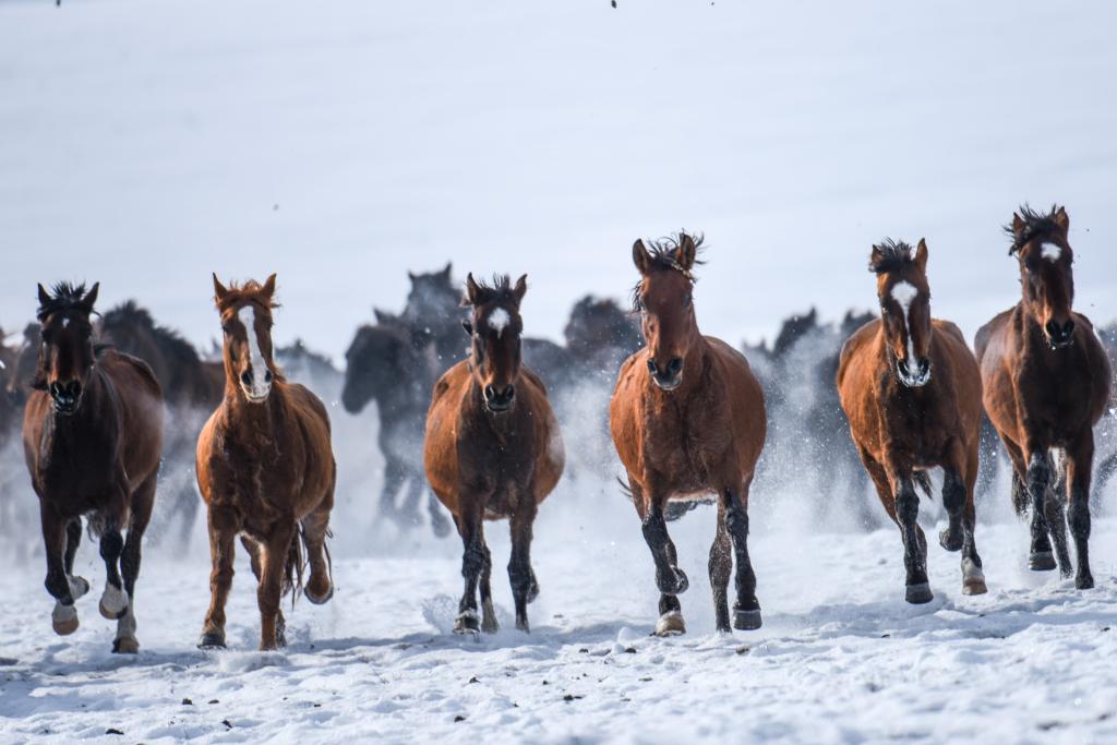 这是2020年12月26日在新疆伊犁哈萨克自治州昭苏县天马旅游文化园拍摄的驰骋的骏马。新华社记者 丁磊 摄