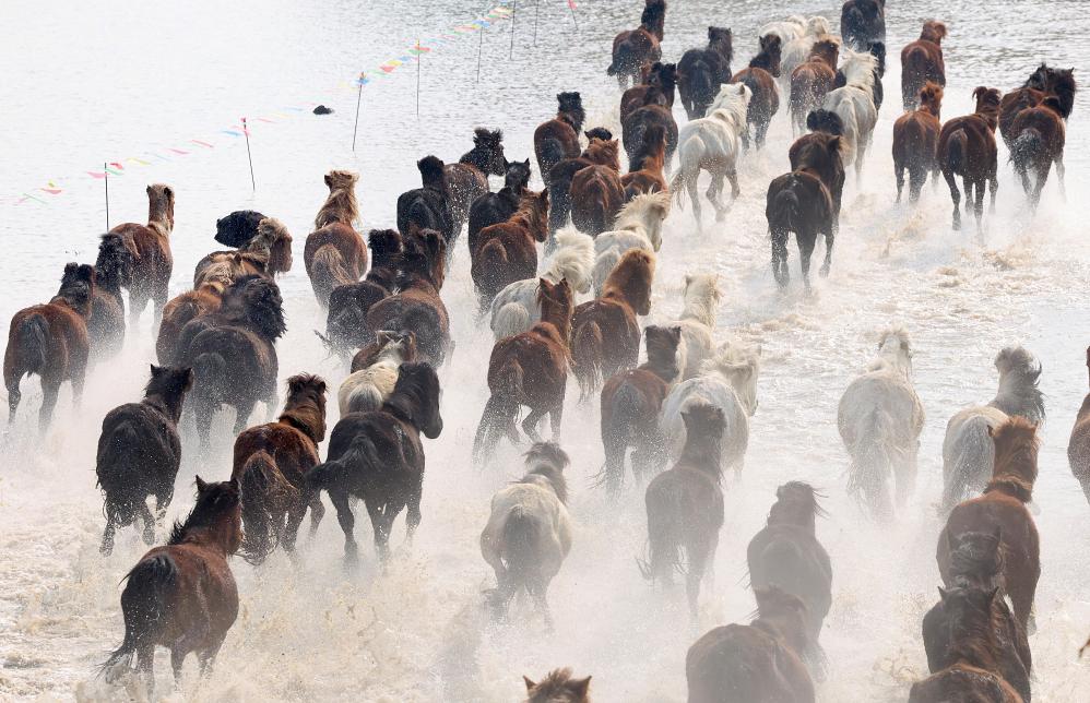 2026年2月12日,骏马在南通森林野生动物园踏水驰骋。新华社发(许丛军 摄)