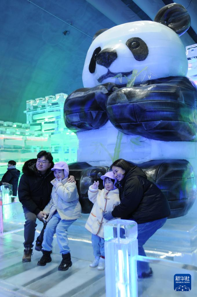 1月13日,在韩国江原道的华川山鳟鱼节现场,游客在哈尔滨工匠制作的大熊猫冰雕作品前留影。