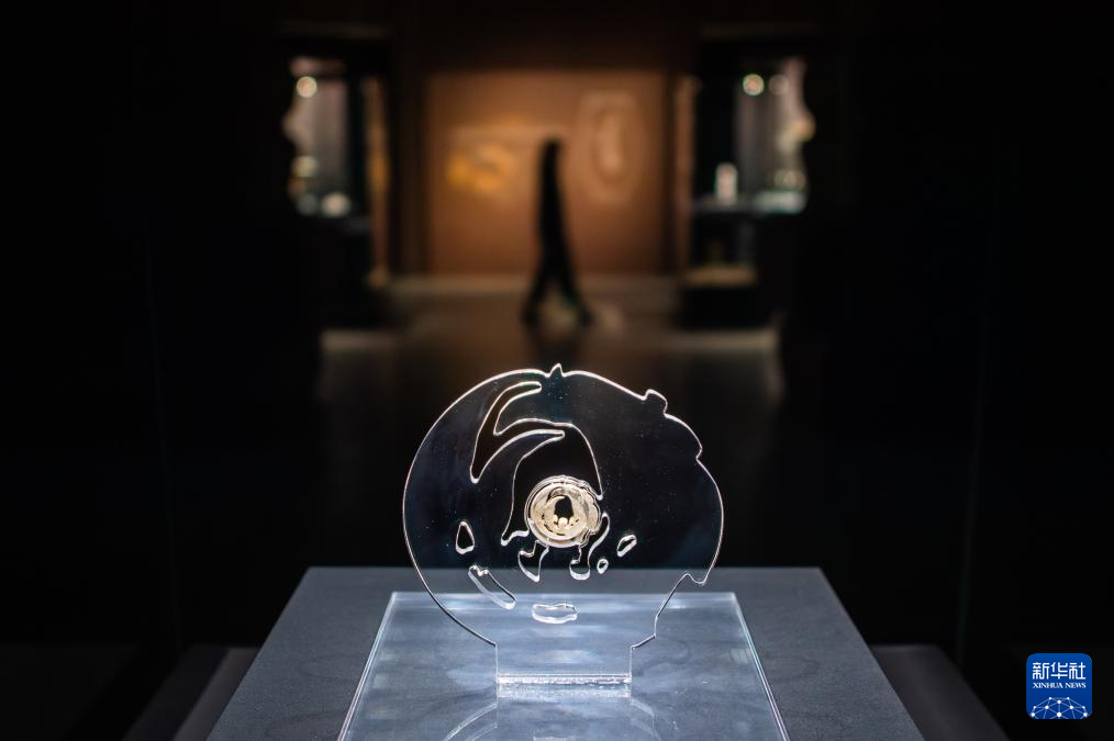3月30日,工作人员在固定展品玉团凤。为迎接玉团凤,武汉盘龙城遗址博物院在玉团凤展柜上方将灯光布置成玉团凤形状。