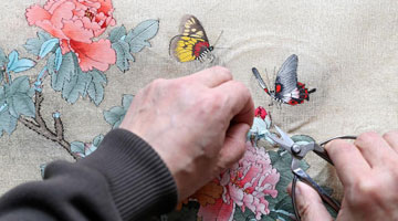 4月9日,申涛在位于营口市的家中对缂丝作品进行最后一道工序——修毛头。