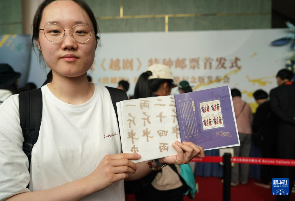 5月20日,来自辽宁的越剧爱好者罗菲展示《越剧》特种邮票之《九斤姑娘》。
