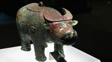 7月4日 ,一位参观者在给孩子讲解展览上的内容。