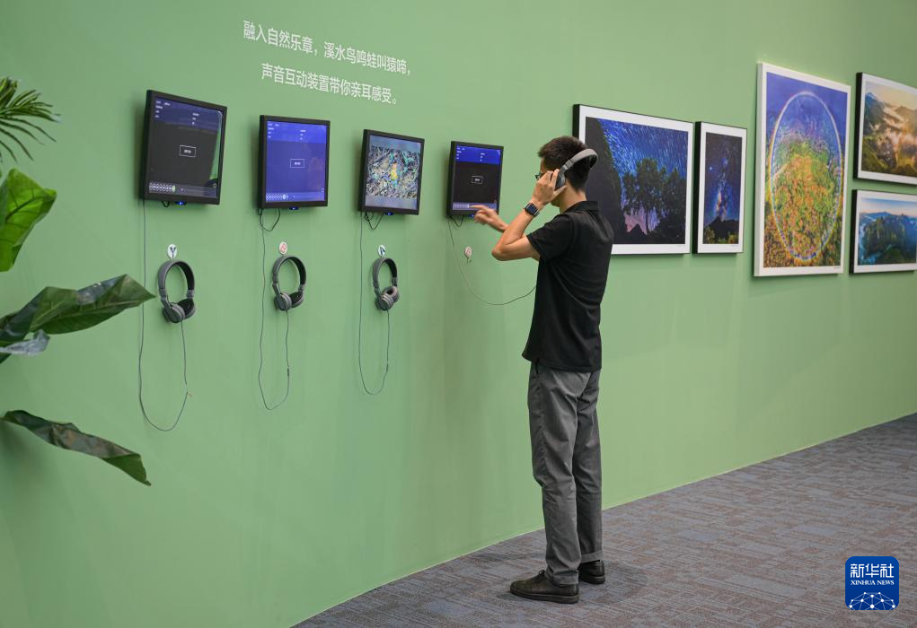 10月13日,在“守护雨林家园——海南热带雨林国家公园建设主题展”上,观众感受溪水、鸟鸣、蛙叫、猿啼等来自海南热带雨林国家公园的声音。