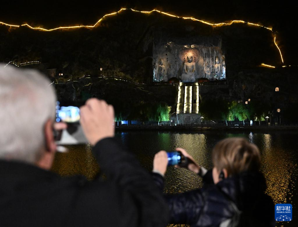 11月4日,外宾在河南省洛阳市龙门石窟景区礼佛台拍照留念。