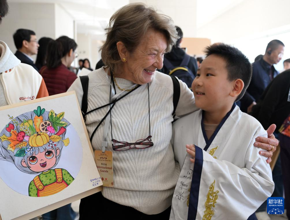 11月5日,外宾在河南省安阳市殷墟博物馆与一名小朋友交流。