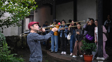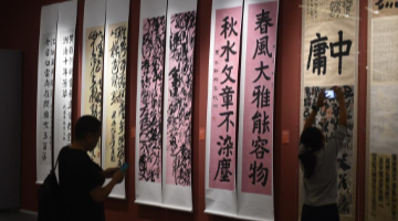 11月13日,工作人员介绍即将展出的船形杯(右)与茶炊。