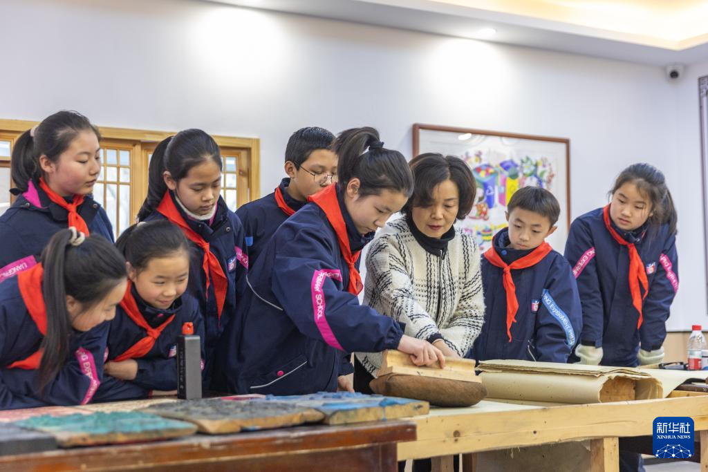 1月15日,在重庆市梁平区梁平实验小学少儿年画馆,梁平木版年画市级代表性传承人莫绍萍指导学生们学习梁平木版年画的刷印。