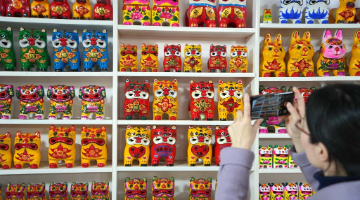 3月19日,一名参观者在姜庄镇用手机拍摄泥老虎产品。