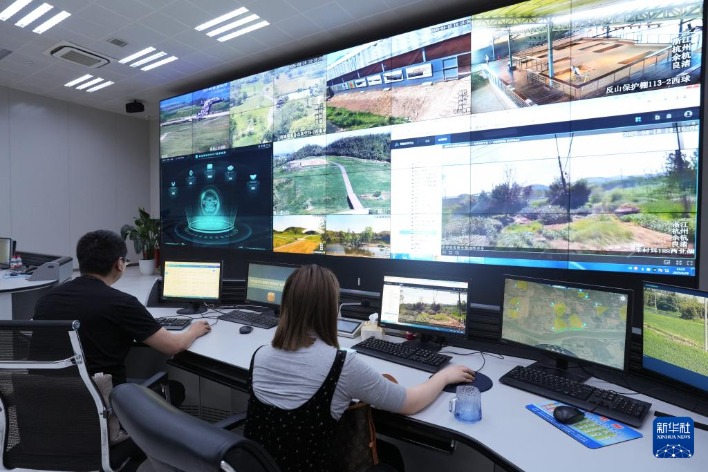 工作人员在良渚古城遗址世界遗产检测管理中心利用“良渚遗址5000+”数智应用监测遗址实时状况(4月18日摄)。