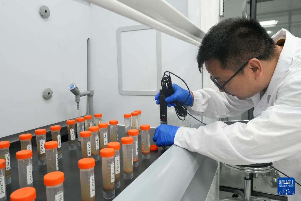 在良渚古城遗址世界遗产检测管理中心,科研人员在做遗址土样酸碱度测试(4月18日摄)。