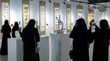 4月28日,观众在青岛电影博物馆电影场记板装饰墙前拍摄。