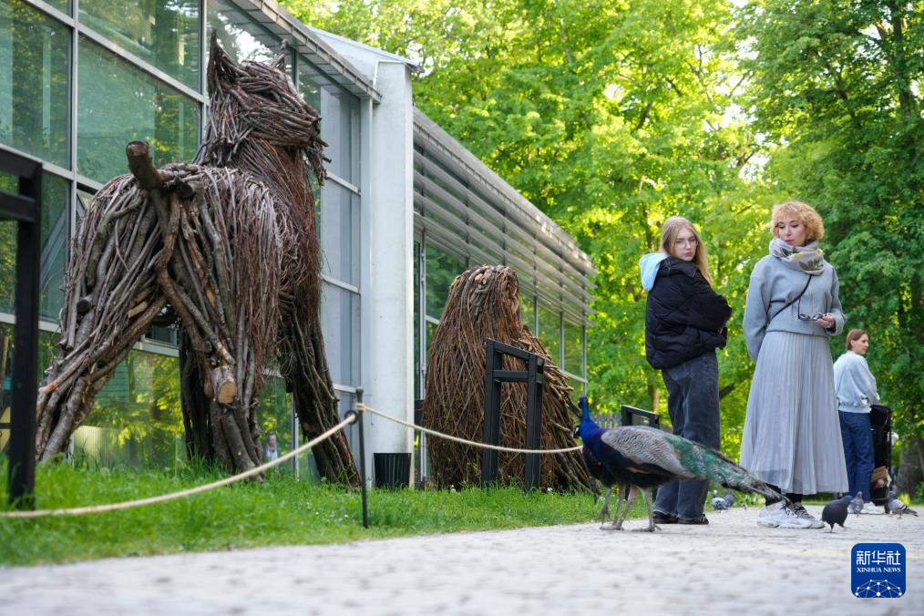 这是5月6日在波兰首都华沙拍摄的猞猁树枝雕塑。