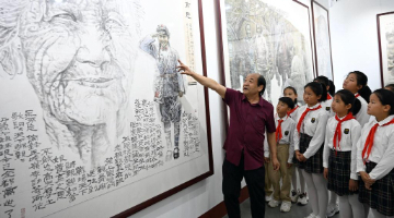 5月22日,嘉宾在美国加利福尼亚州奥兰治县宝尔博物馆通过平板电脑为兵马俑战士绘制彩色战衣。