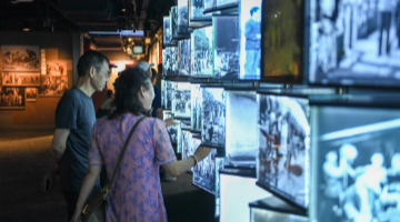 8月7日,游客在长影旧址博物馆观看电影歌舞剧《白毛女》。