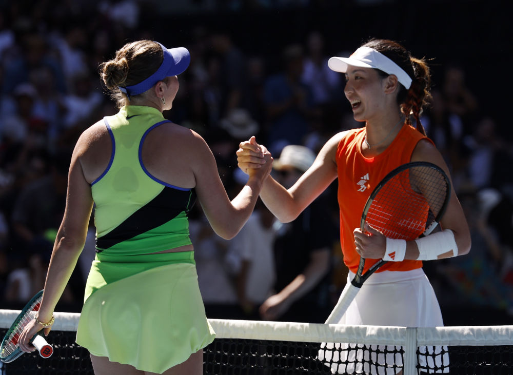 1月26日,王欣瑜(右)与阿尼西莫娃在2026年澳大利亚网球公开赛女单第四轮比赛后握手致意。新华社记者 马平 摄