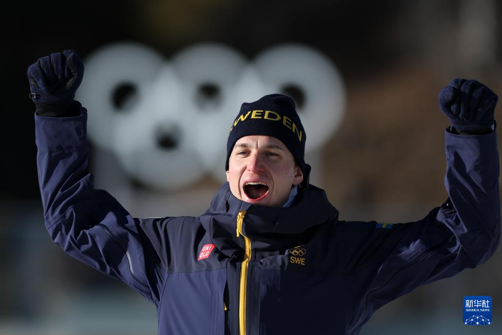 2月15日,冠军瑞典选手蓬西卢奥马在颁奖仪式上庆祝。