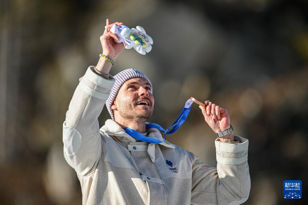 2月15日,季军法国选手雅克兰在颁奖仪式上庆祝。
