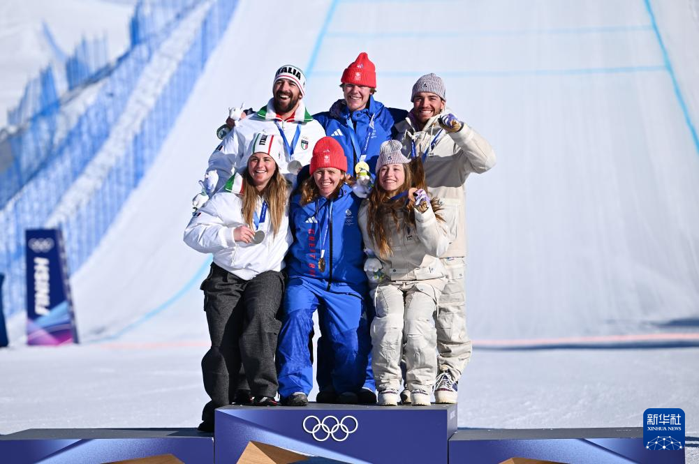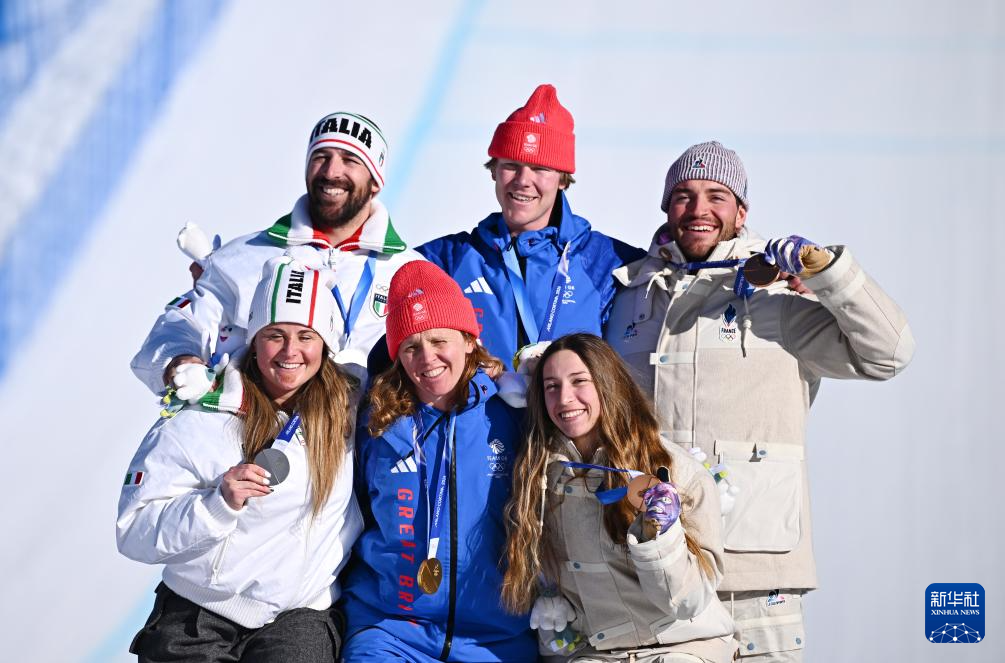 2月15日,冠军英国1队组合休·奈廷格尔(右三)/夏洛特·班克斯(左三),亚军意大利1队组合洛伦佐·索马里瓦(左二)/米凯拉·莫约利(左一),季军法国2队组合洛昂·博佐洛(右一)/莱娅·卡斯塔在颁奖仪式上。