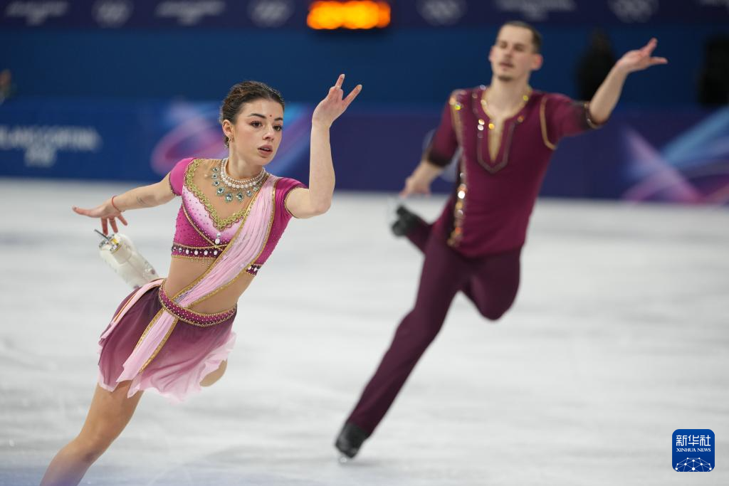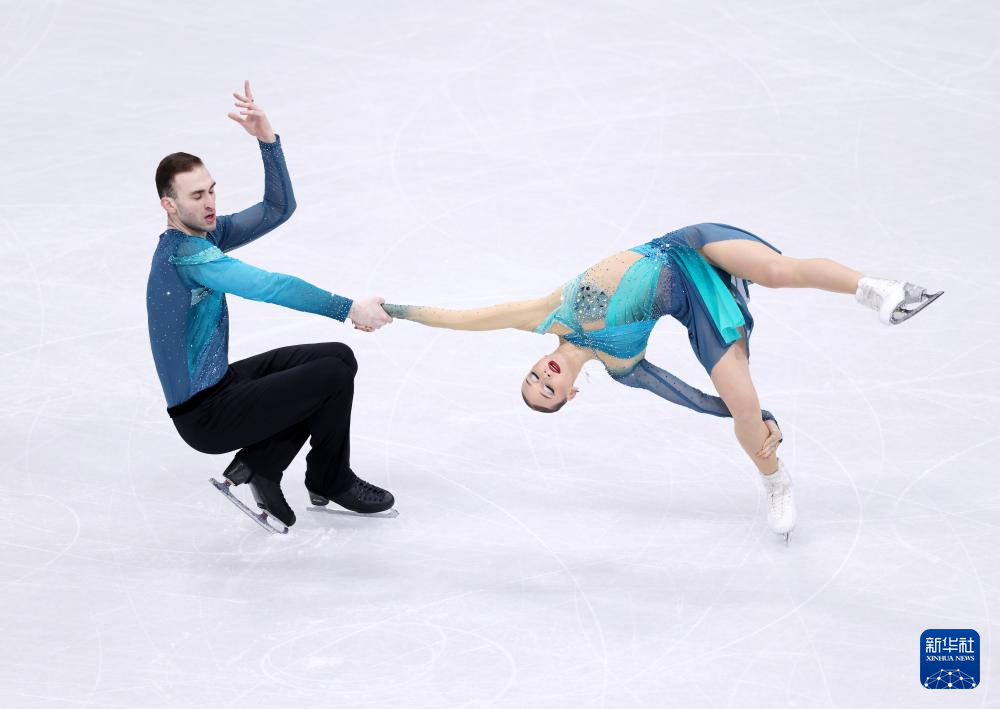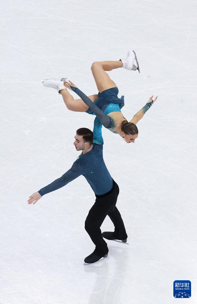 2月16日,格鲁吉亚组合梅特尔基娜/别鲁拉瓦(左)在比赛中。他们获得双人滑项目亚军。