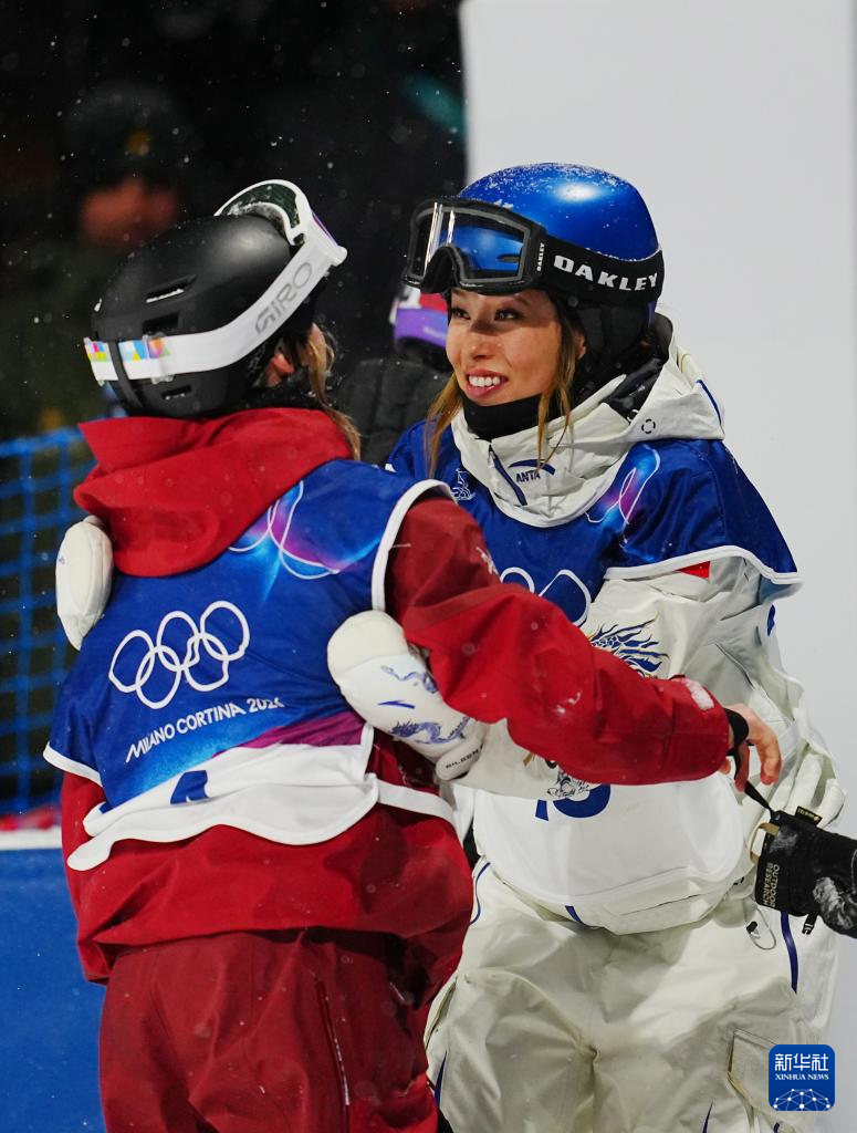 2月16日,加拿大选手梅根·奥尔德姆(右前)在赛后与中国选手谷爱凌(右后)拥抱。她们分获冠、亚军。