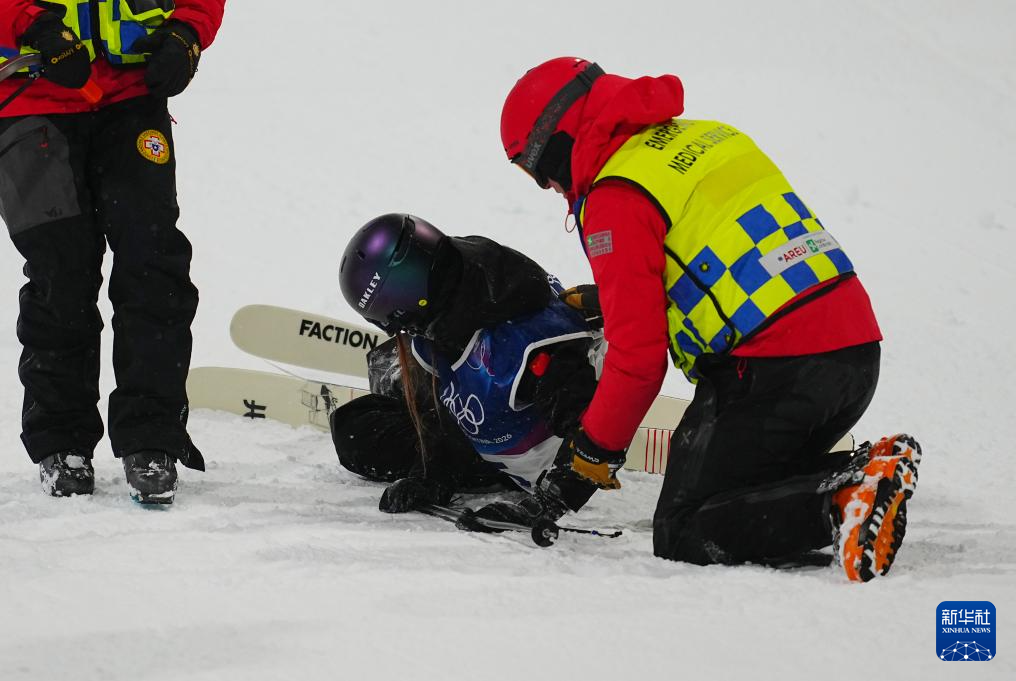 2月16日,中国选手刘梦婷(中)在赛前训练摔倒后接受医疗团队的帮助。