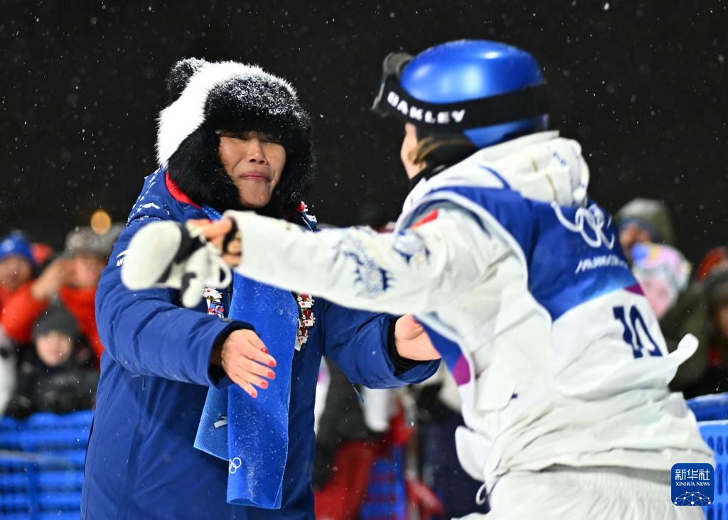 2月16日,中国选手谷爱凌(左)在第三跳后与在场边的母亲拥抱。她获得亚军。