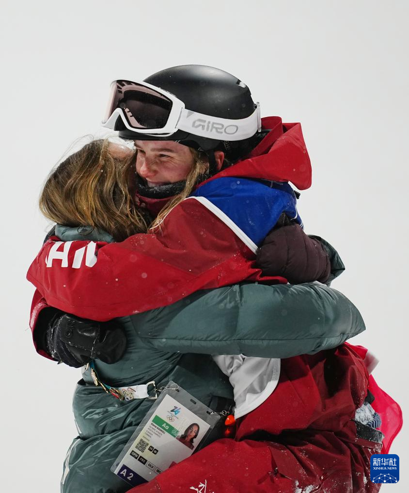 2月16日,加拿大选手梅根·奥尔德姆(右)在赛后与中国选手谷爱凌拥抱。她们分获冠、亚军。
