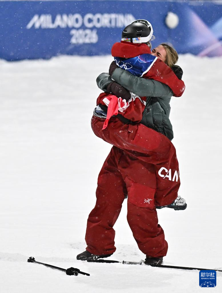 2月16日,加拿大选手梅根·奥尔德姆(后)在比赛后拥抱队友。她获得冠军。