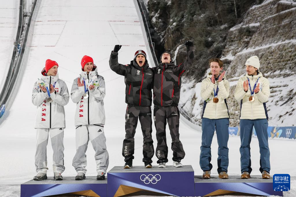2月16日,冠军奥地利队(中)、亚军波兰队(左)、季军挪威队在颁奖仪式上。
