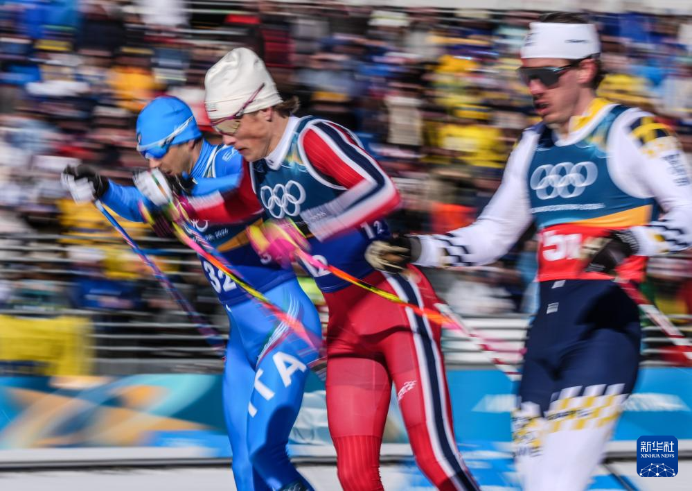 2月18日,挪威队选手克莱博(中)在比赛中。