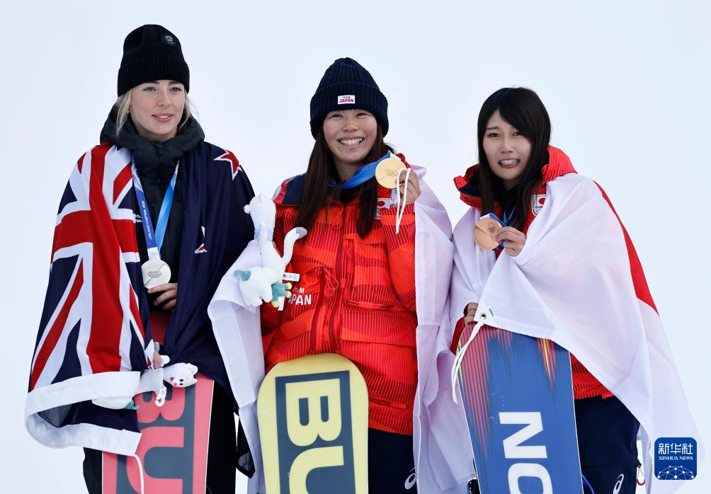 2月18日,冠军日本选手深田茉莉(中)、亚军新西兰选手萨多夫斯基和季军日本选手村濑心椛在颁奖仪式上。