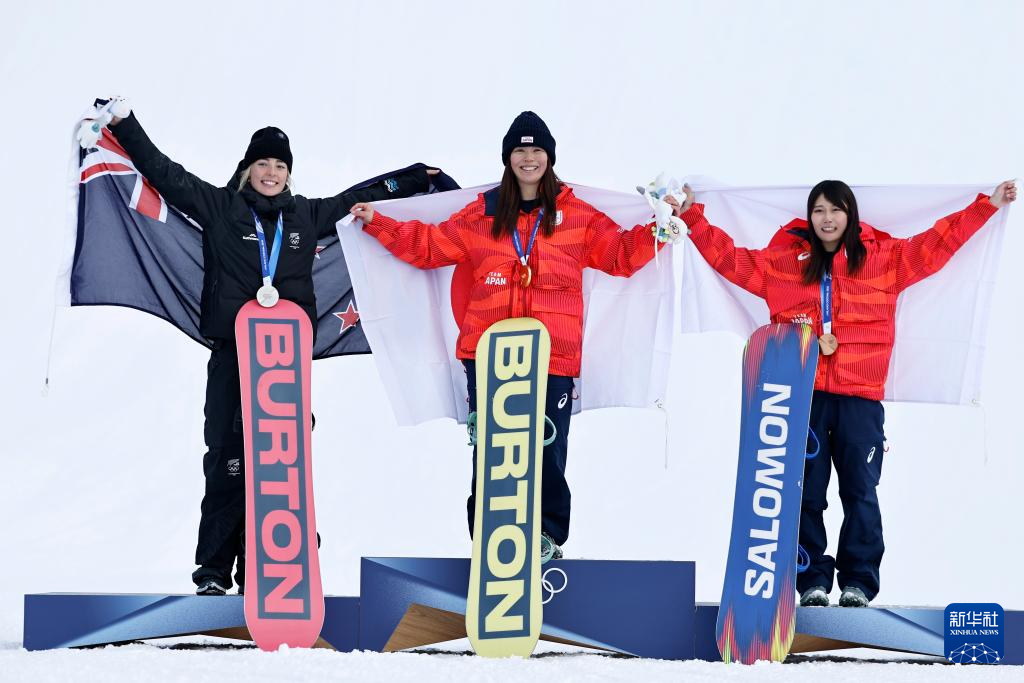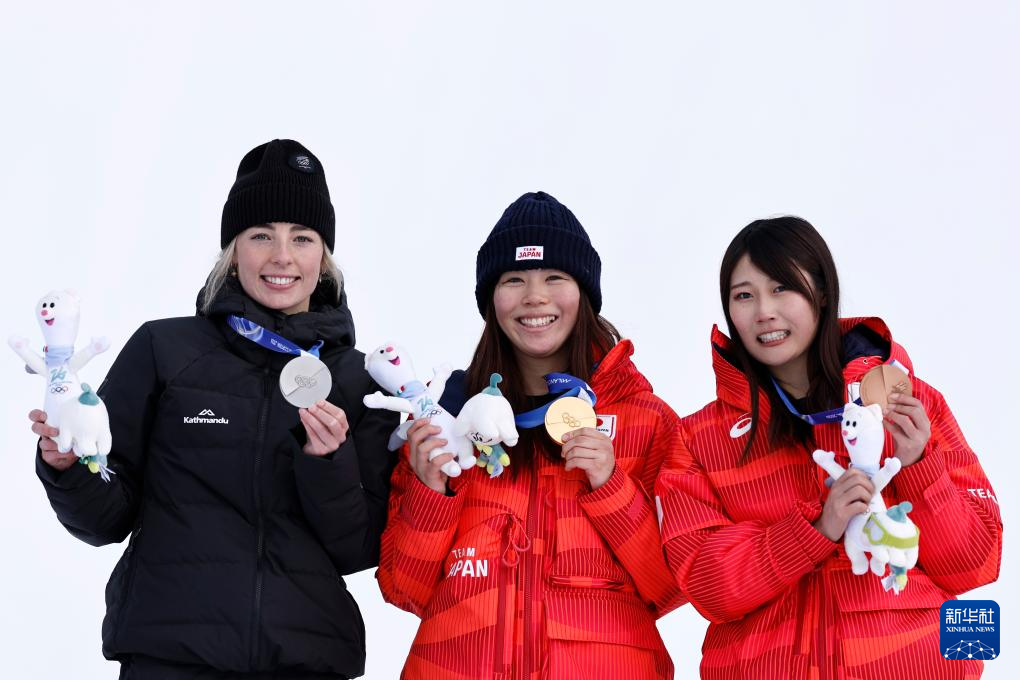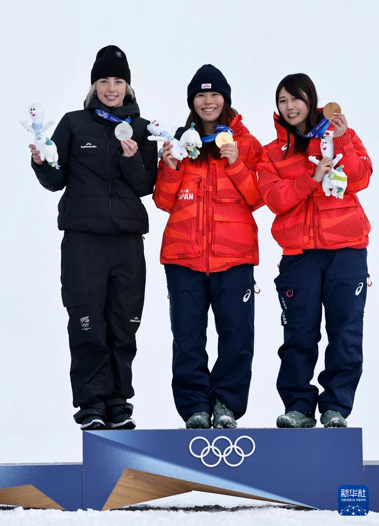 2月18日,冠军日本选手深田茉莉(中)、亚军新西兰选手萨多夫斯基(左)和季军日本选手村濑心椛在颁奖仪式上合影。