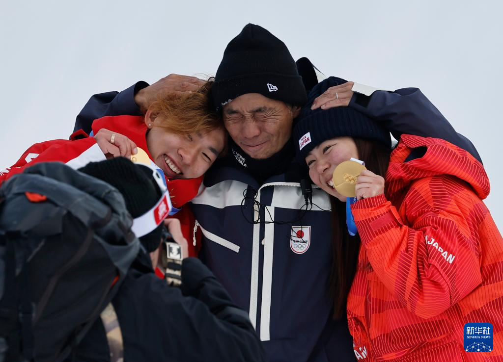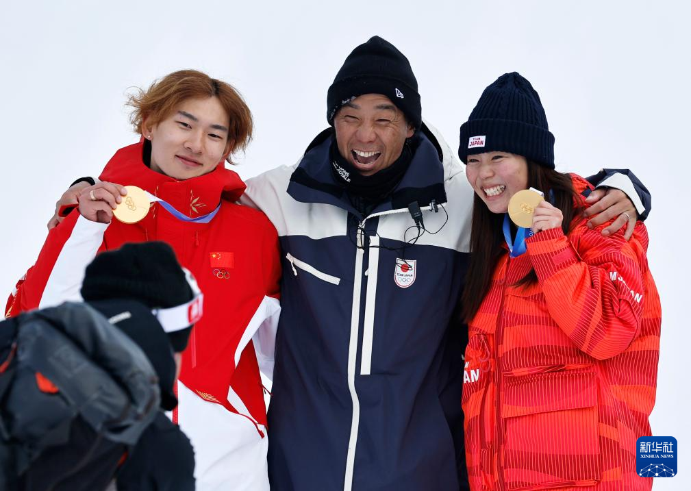 2月18日,女子坡面障碍技巧冠军日本选手深田茉莉(右)、男子坡面障碍技巧冠军中国选手苏翊鸣(左)与教练佐藤康弘庆祝。
