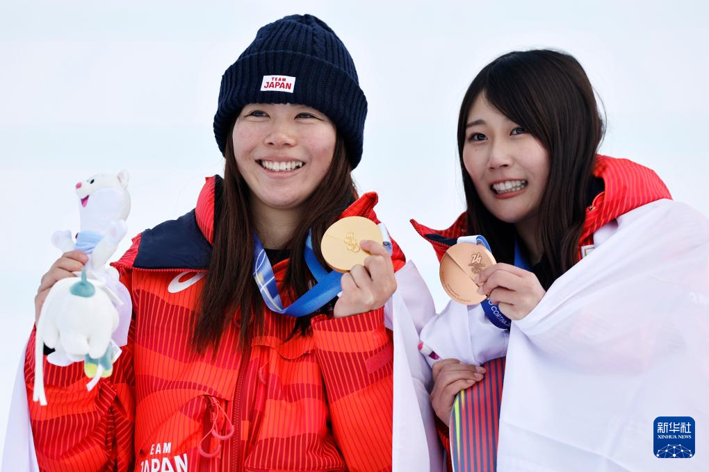 2月18日,日本选手深田茉莉(左)在比赛后。她获得冠军。