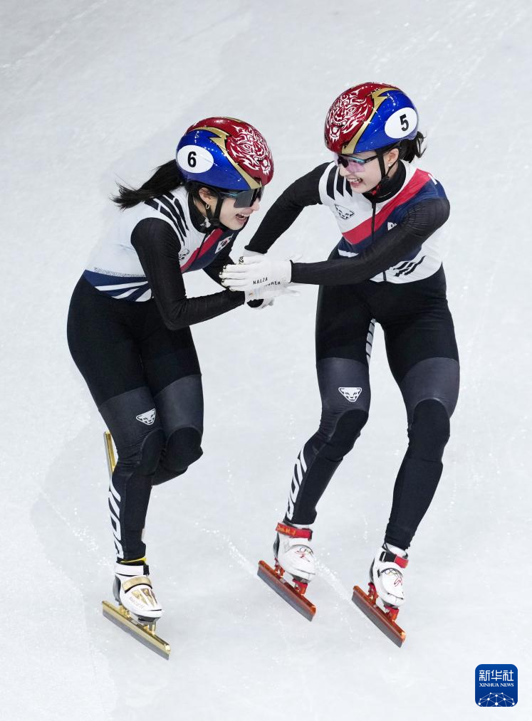 2月18日,韩国队选手金吉莉(左)在比赛中率先冲线后庆祝。