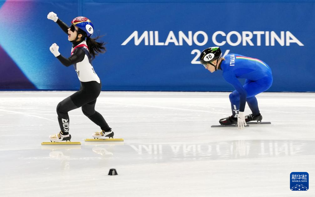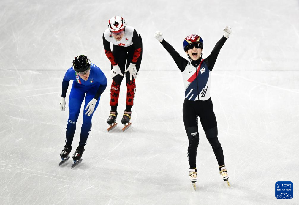 2月18日,韩国队选手金吉莉率先冲线后庆祝。