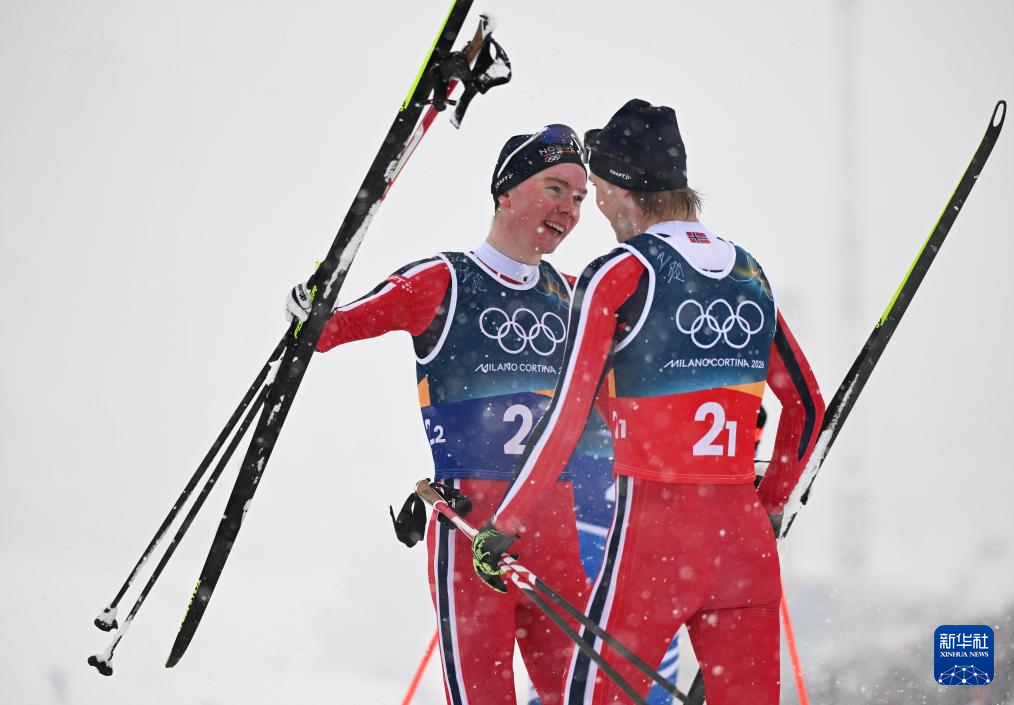 2月19日,挪威队选手奥夫特布罗(左)与斯科格隆在冲线后拥抱致意。
