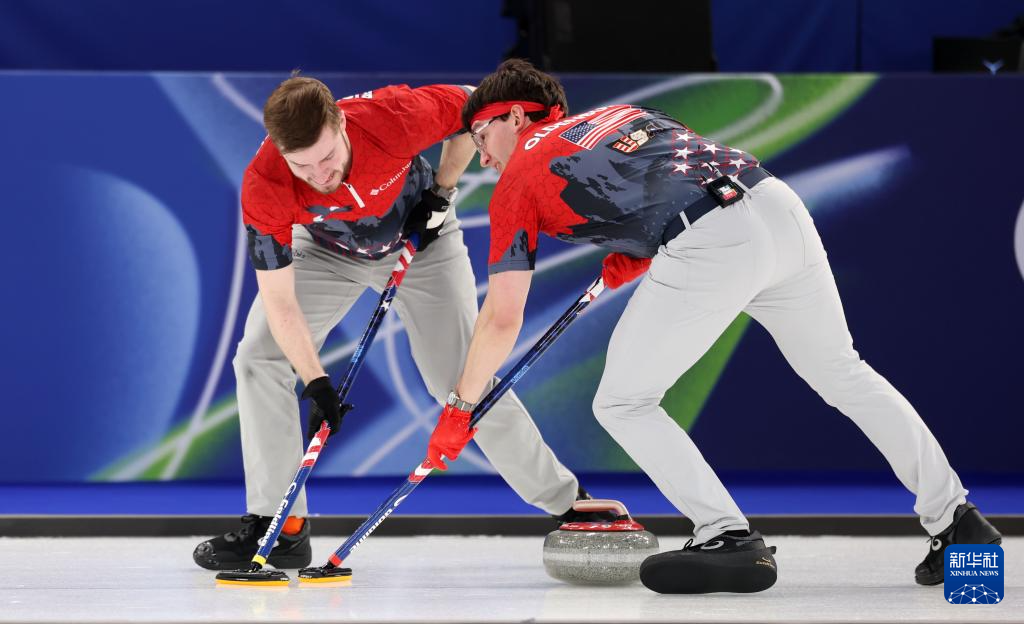 2月18日,英国队选手哈迪(左)和莫阿特在对阵美国队的比赛中。英国队9比2战胜美国队。