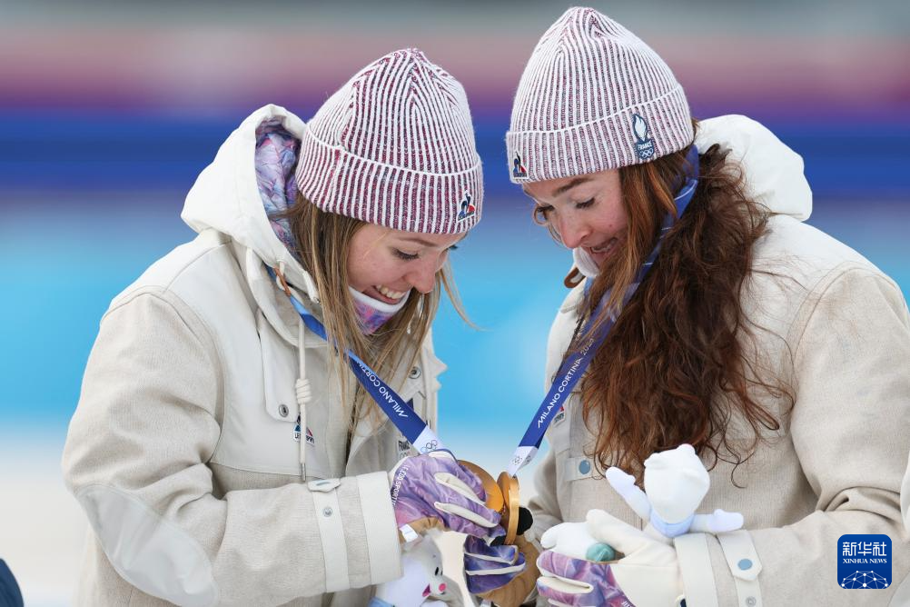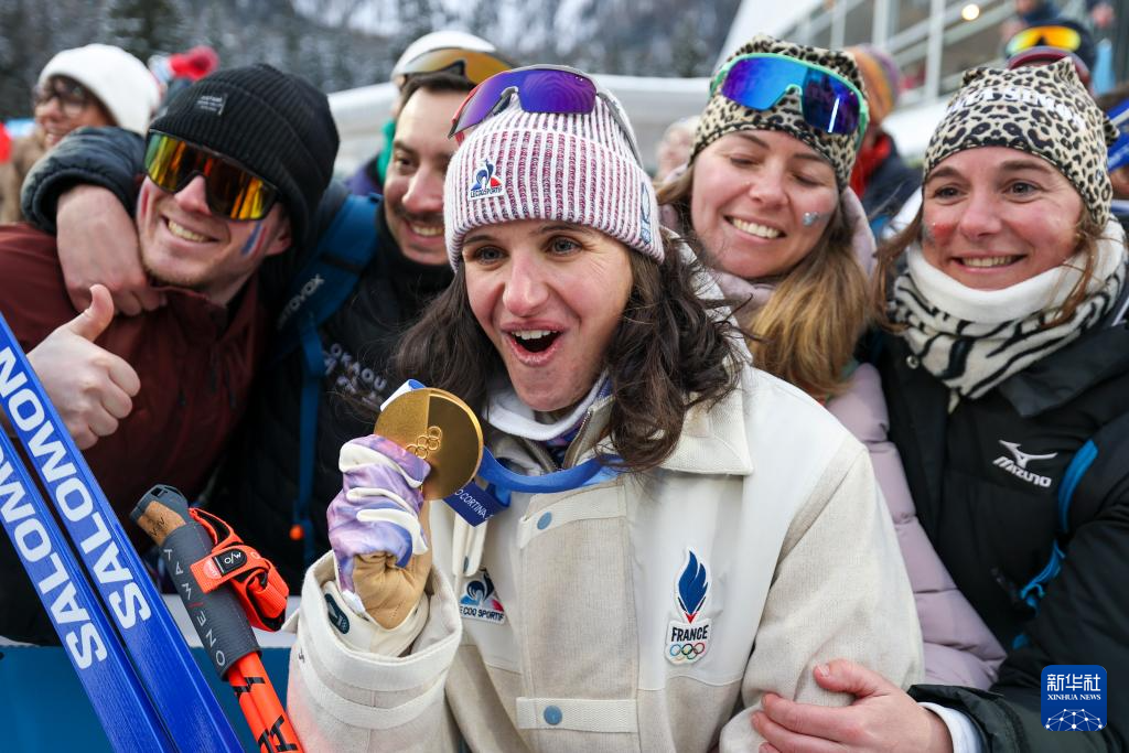 2月18日,法国队选手卡米耶·贝内在颁奖仪式上庆祝。