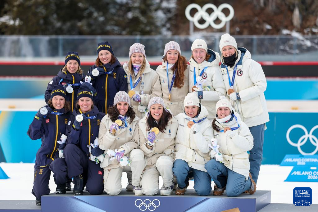 2月18日,冠军法国队、亚军瑞典队、季军挪威队在颁奖仪式上合影。