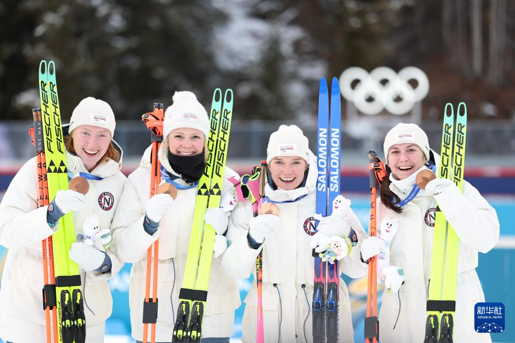 2月18日,季军挪威队在颁奖仪式后庆祝。