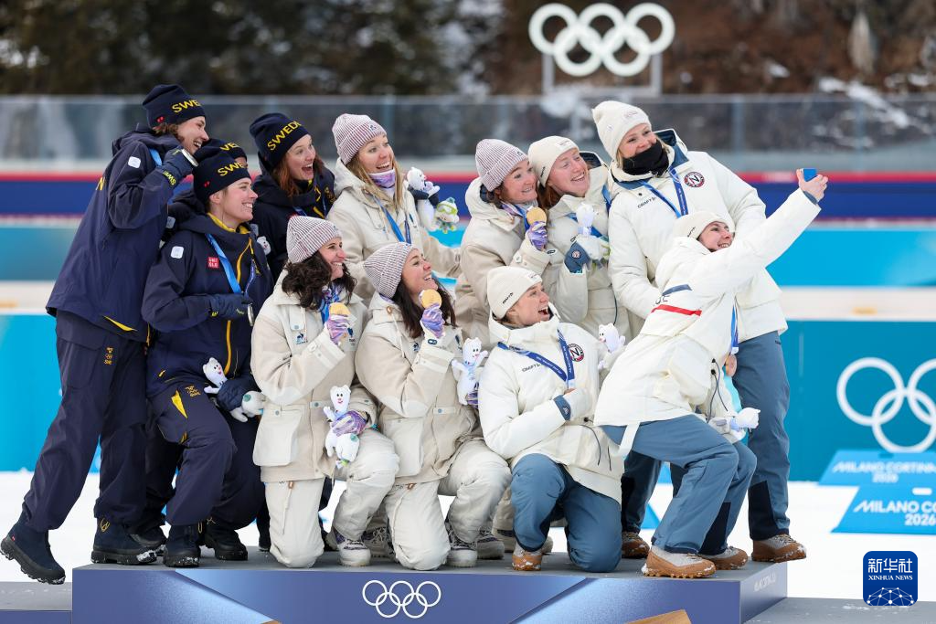 2月18日,冠军法国队、亚军瑞典队、季军挪威队在颁奖仪式上自拍合影。